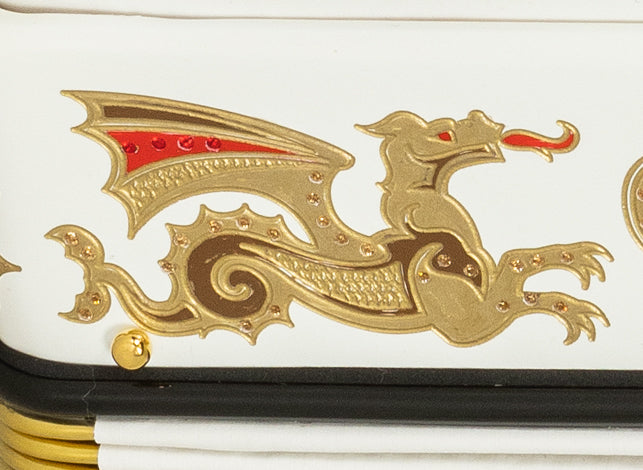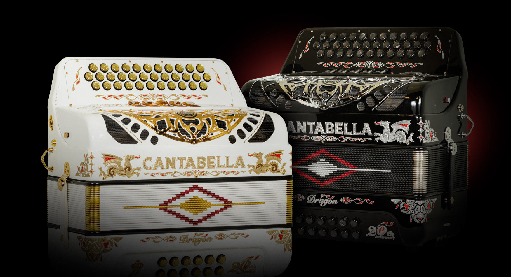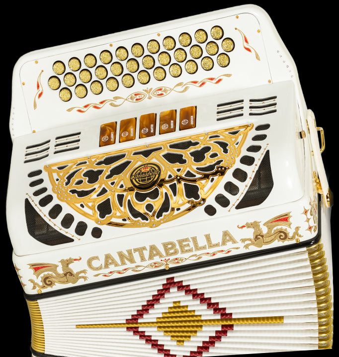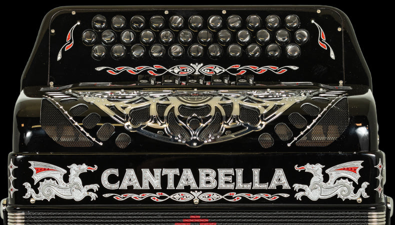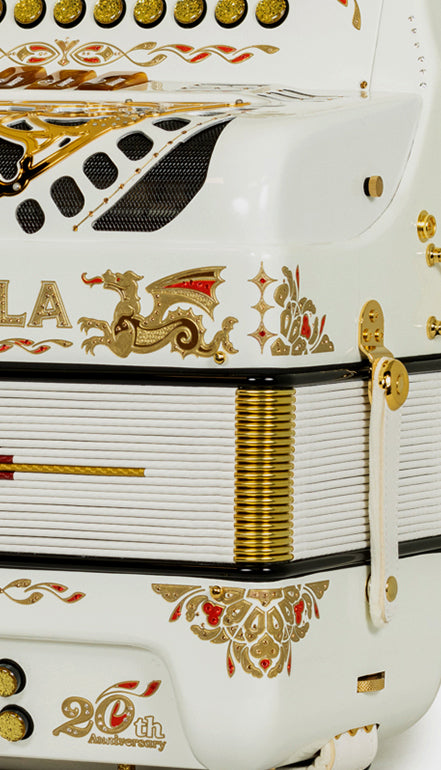 "Cantabella Dragón es un modelo especial creado para conmemorar el vigésimo aniversario de Cantabella Accordions. Inspirado en uno de los primeros y más emblemáticos diseños de la marca, este acordeón reinterpreta el icónico dragón de Cantabella con sutiles actualizaciones estéticas que fusionan la esencia y el carácter del pasado con la elegancia y la visión del futuro.